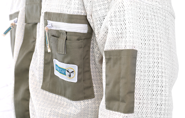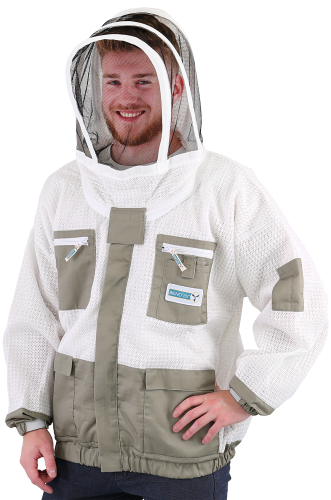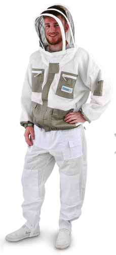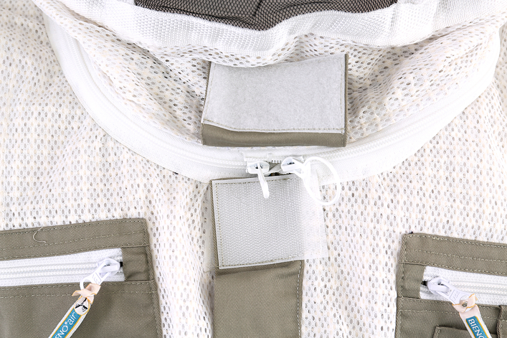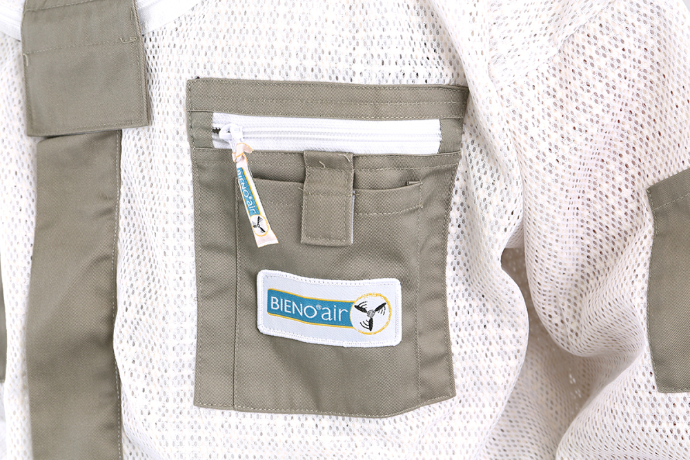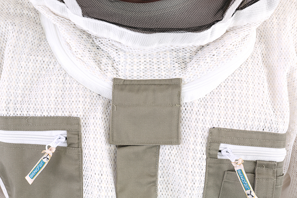 Die ventilierende Schutzbekleidung in innovativer BienoAir® Machart - luftig und atmend. Hergestellt in drei Lagen, weiß/khaki und voll waschbar. Angenehmer, leichter Tragekomfort gepaart mit praktischen Details wie verdecktem Reißverschluss, fünf verschließbaren Taschen, einstellbaren Gummibündchen an den Ärmeln sowie sich selbst aufstellender, englischer Imkerhaube