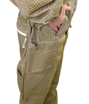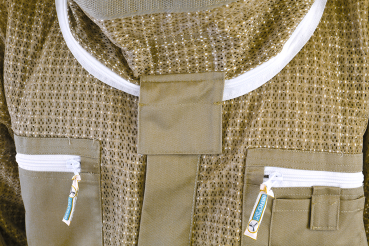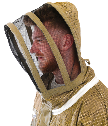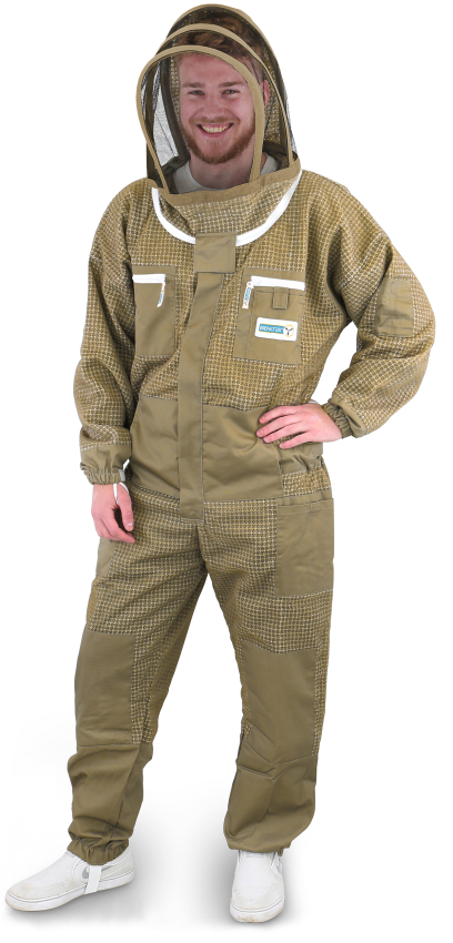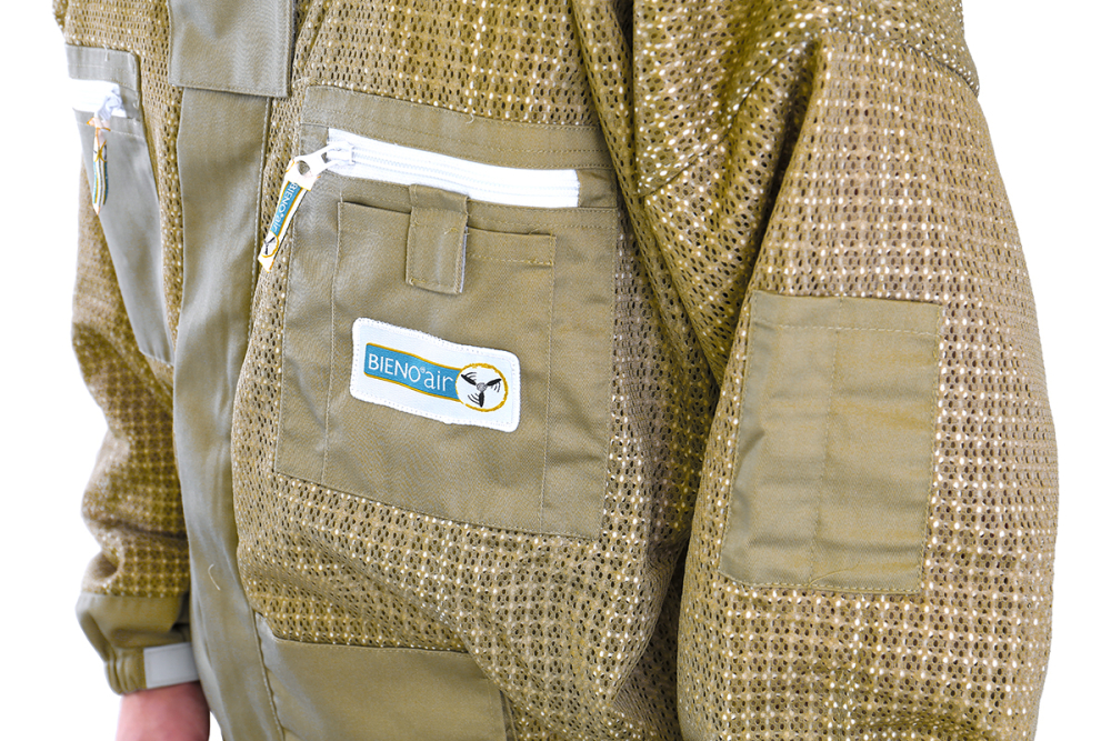 Die ventilierende Schutzbekleidung in innovativer BienoAir® Machart - luftig und atmend. Hergestellt in drei Lagen, oliv und voll waschbar. Angenehmer, leichter Tragekomfort gepaart mit praktischen Details wie verdecktem Reißverschluss, acht Taschen, Gummibündchen an Ärmeln und Beinen sowie sich selbst aufstellender, englischer Imkerhaube Design registriert beim DPMA und gesetzlich geschützt