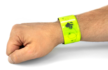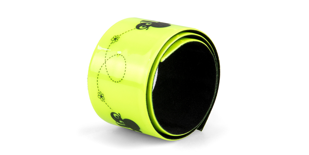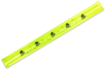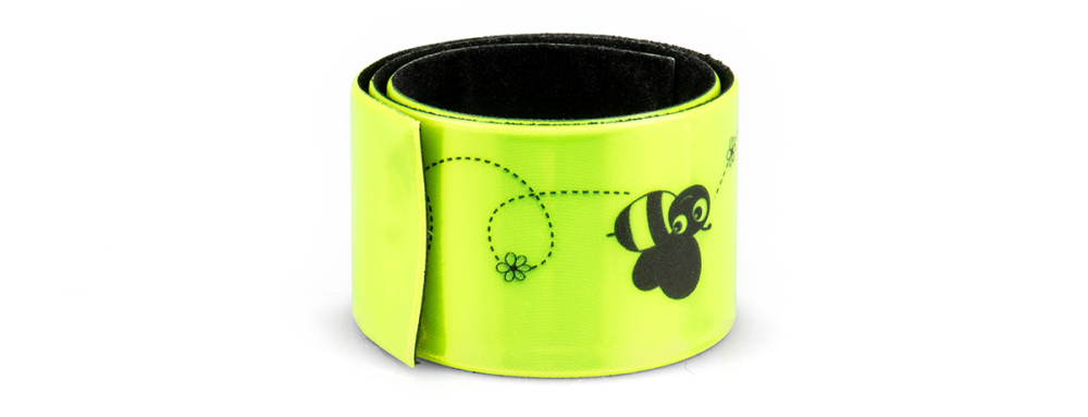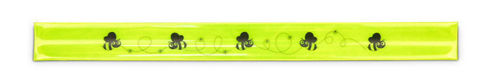 Reflektierendes, neongelbes Schnappband mit Aufdruck „Bienen“ für eine bessere Sichtbarkeit im Straßenverkehr. Hergestellt aus Kunststoff zum Tragen an Armen oder Beinen Länge ca. 33,5 cm, Breite ca. 3 cm