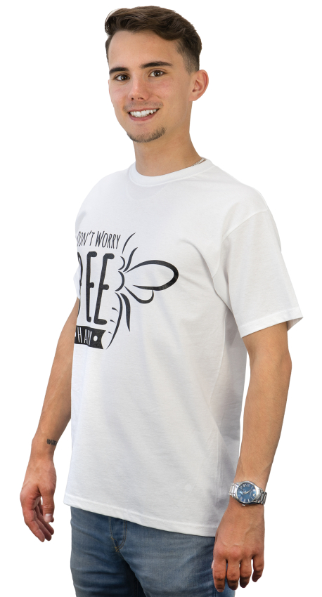 hergestellt aus 100% reiner Baumwolle. Weiß mit Rundhals und Aufdruck, voll waschbar