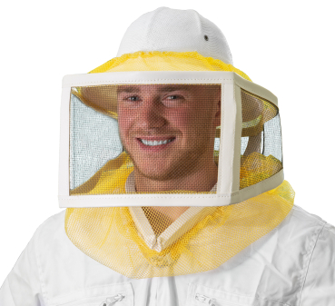 faltbar, hergestellt aus stabilem Drahtgeflecht und gelbem Schleierstoff. Augestattet mit je einem Gummizug oben und unten sowie einer Befestigungskordel. Sehr gut mit dem Sonny Imkerhelm oder dem Ami-Hut kombinierbar