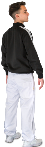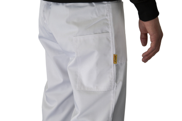 leichtere Stoffausführung aus 65% Polyester und 35% Baumwolle, weiß und voll waschbar. Ausgestattet mit zwei Vorder-, einer Handy/Werkzeugtasche, Gürtelschlaufen, Gummizug, Reißverschluss und Gummibündchen an den Beinen, voll waschbar, ohne Gürtel