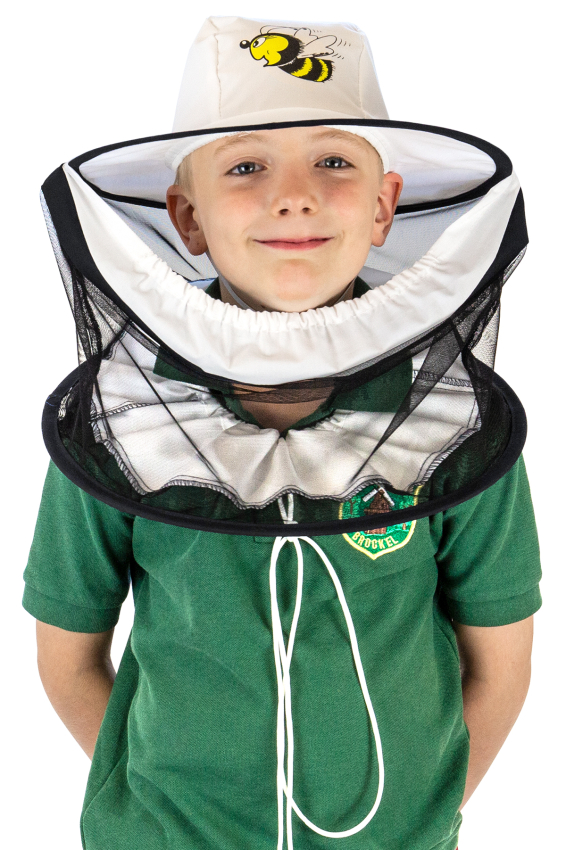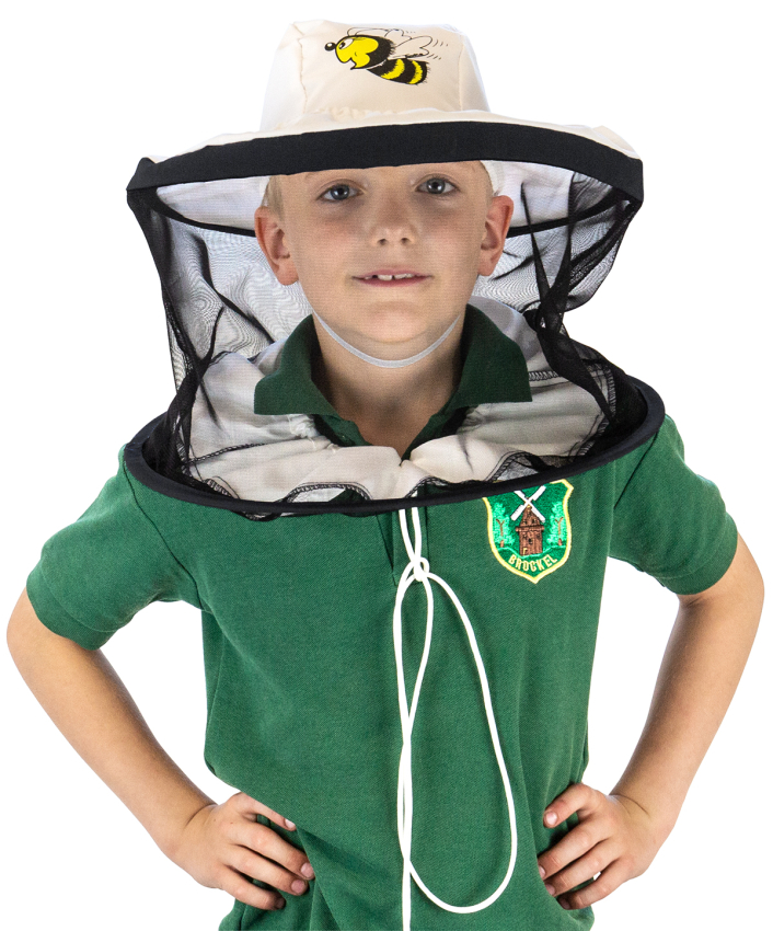 weißer Schleier mit Bienenmotiv für Kids und Jugendliche von 4 bis 16 Jahren. Hut und Schleier sind fest zusammengenäht, zwei Distanzringe sorgen für sicheren Abstand. Der Schleier kann vorne unter das Kinn gezogen werden, z. B. zum Essen oder Trinken. Ein einstellbarer Gummizug dient zur Befestigung an einem Hemd- oder Wulstkragen. 65 % Baumwolle und 35 % Polyester, Durchmesser 33 cm