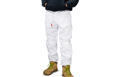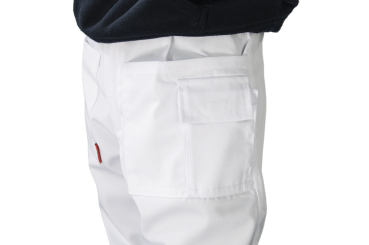 aus Baumwoll-Köperstoff, weiß und voll waschbar. Ausgestattet mit zwei Vorder-, einer Gesäß- und einer Handytasche, Gürtelschlaufen, Reißverschluss und Gummibündchen an den Beinen, voll waschbar, ohne Gürtel