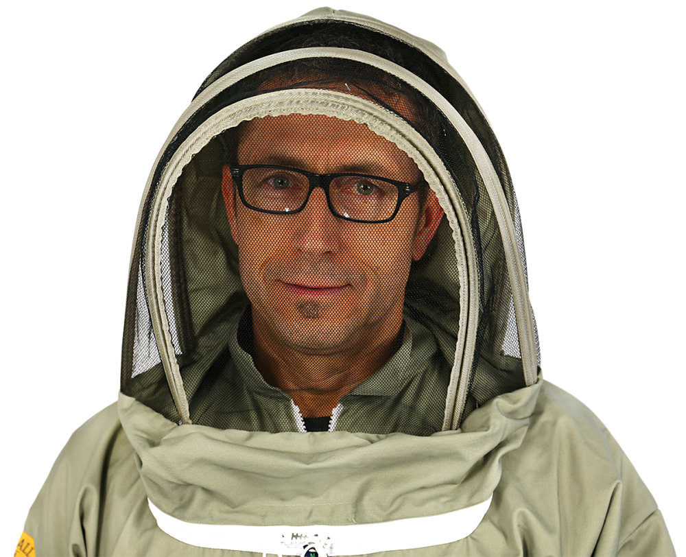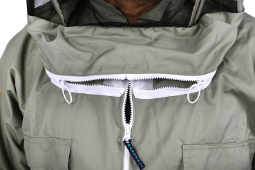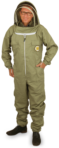 Besonders leichter und ergonomischer Imker-Vollschutzanzug, hergestellt aus 65% Polyester und 35% Baumwolle, khakifarben und voll waschbar. Ausgestattet mit sieben Taschen, Gummibündchen an Beinen und Ärmeln, hier mit zusätzlicher Daumenschlaufe, sowie YKK-Reißverschlüsse vorne und an der abnehmbaren Haube. Besonderheit: Die sich selbst aufstellende Imkerhaube nach englischem Vorbild mit schwarzem ProFlex Visiergewebe