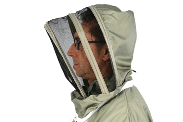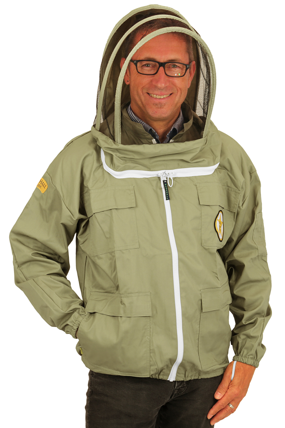 Besonders leichte und ergonomische Imkerbluse, hergestellt aus 65% Polyester und 35% Baumwolle, khakifarben und voll waschbar. Ausgestattet mit vier großen Taschen, Gummibündchen an den Ärmeln mit zusätzlicher Daumenschlaufe sowie strapazierfähigen YKK-Reißverschlüssen. Besonderheit: Die sich selbst aufstellende Imkerhaube nach englischem Vorbild mit schwarzem ProFlex Visiergewebe