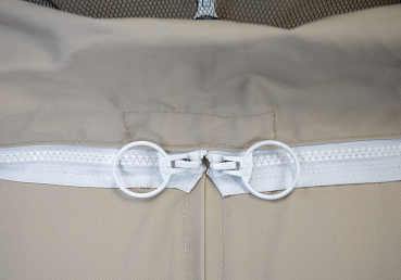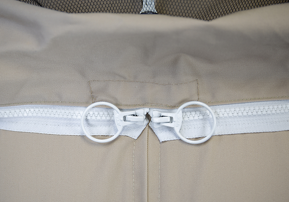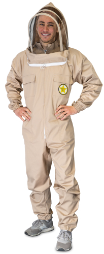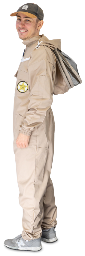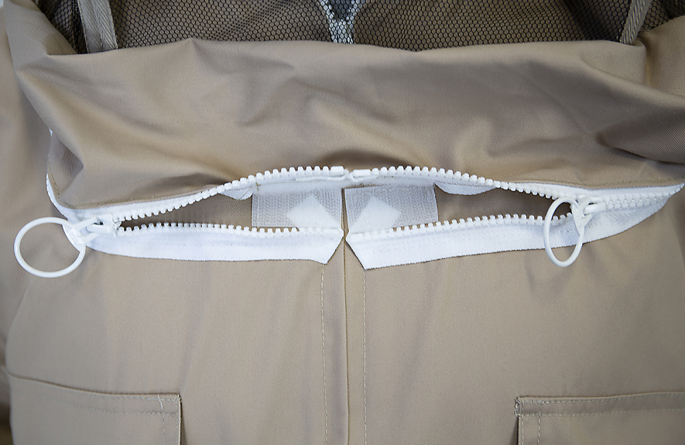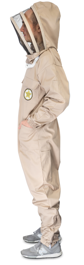 Besonders leichter und ergonomischer Imker-Vollschutzanzug, hergestellt aus 65% Polyester und 35% Baumwolle, mokkafarben und voll waschbar. Ausgestattet mit sieben Taschen, Gummibündchen an Beinen und Ärmeln, hier mit zusätzlicher Daumenschlaufe, sowie YKK-Reißverschlüsse vorne und an der abnehmbaren Haube. Besonderheit: Die sich selbst aufstellende Imkerhaube nach englischem Vorbild mit schwarzem ProFlex Visiergewebe