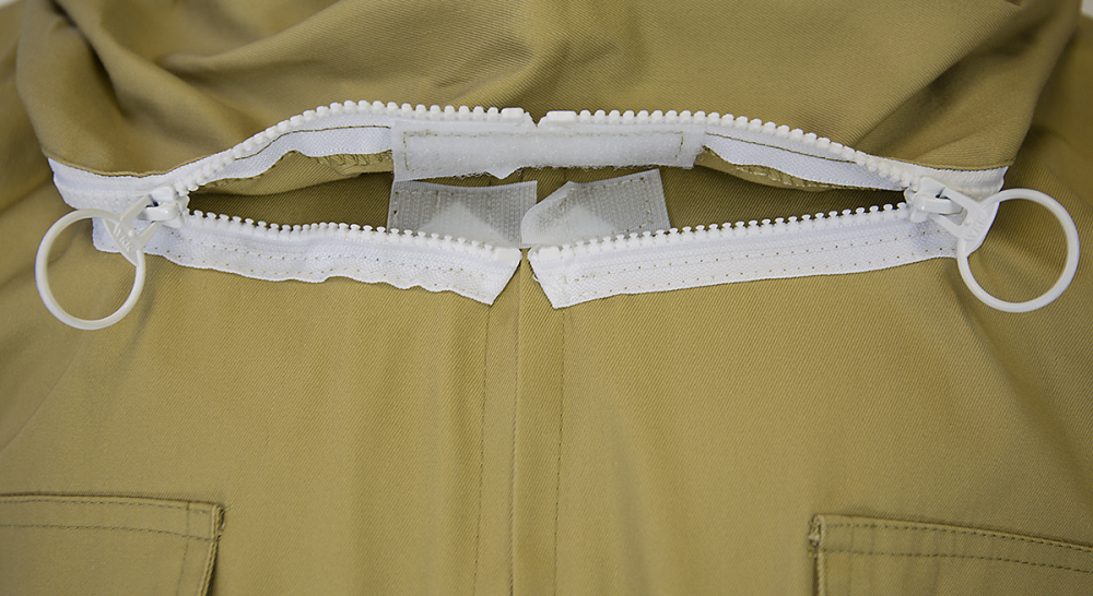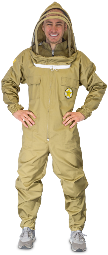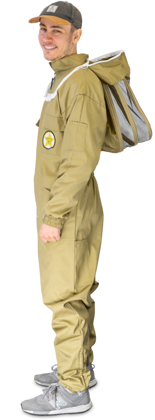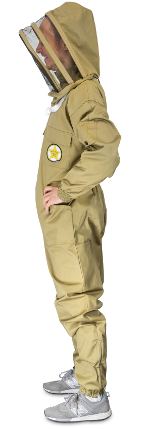 Besonders leichter und ergonomischer Imker-Vollschutzanzug, hergestellt aus 65% Polyester und 35% Baumwolle, olivfarben und voll waschbar. Ausgestattet mit sieben Taschen, Gummibündchen an Beinen und Ärmeln, hier mit zusätzlicher Daumenschlaufe, sowie YKK-Reißverschlüsse vorne und an der abnehmbaren Haube. Besonderheit: Die sich selbst aufstellende Imkerhaube nach englischem Vorbild mit schwarzem ProFlex Visiergewebe