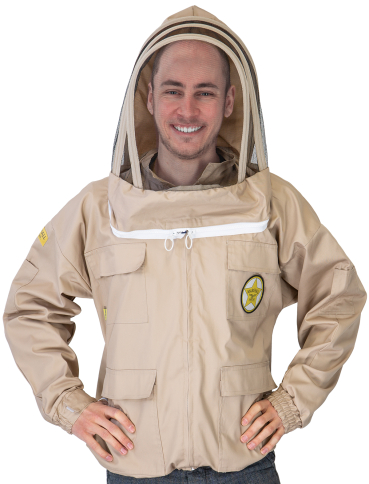 Besonders leichte und ergonomische Imkerbluse, hergestellt aus 65% Polyester und 35% Baumwolle, mokkafarben und voll waschbar. Ausgestattet mit vier großen Taschen, Gummibündchen an den Ärmeln mit zusätzlicher Daumenschlaufe sowie strapazierfähigen YKK-Reißverschlüssen. Besonderheit: Die sich selbst aufstellende Imkerhaube nach englischem Vorbild mit schwarzem ProFlex Visiergewebe