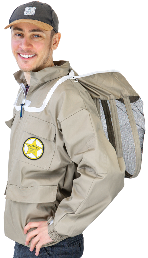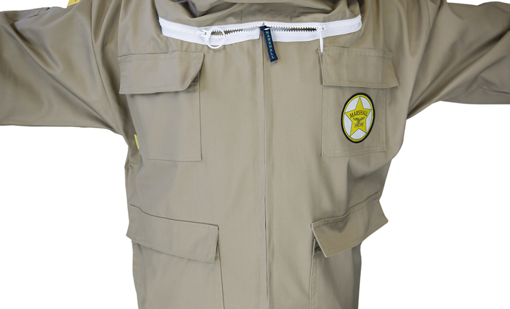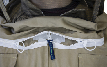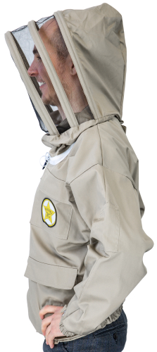 Besonders leichte und ergonomische Imkerbluse, hergestellt aus 65% Polyester und 35% Baumwolle, terrafarben und voll waschbar. Ausgestattet mit vier großen Taschen, Gummibündchen an den Ärmeln mit zusätzlicher Daumenschlaufe sowie strapazierfähigen YKK-Reißverschlüssen. Besonderheit: Die sich selbst aufstellende Imkerhaube nach englischem Vorbild mit schwarzem ProFlex Visiergewebe