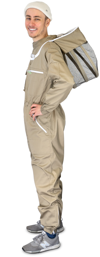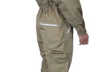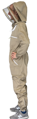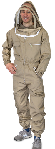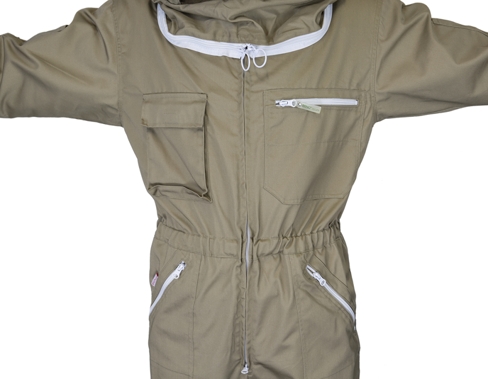leichtere Stoffausführung aus 65% Polyester und 35% Baumwolle, terrafarben und voll waschbar. Diverse Taschen mit Reißverschluss, einstellbaren Gummibündchen an den Ärmeln sowie mit sich selbst aufstellender, Englischer Imkerhaube mit schwarzem ProFlox Visiergewebe. Aufgrund des vorderen Reißverschlusses kann das Hemd auch wie eine Jacke genutzt werden