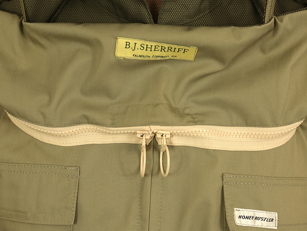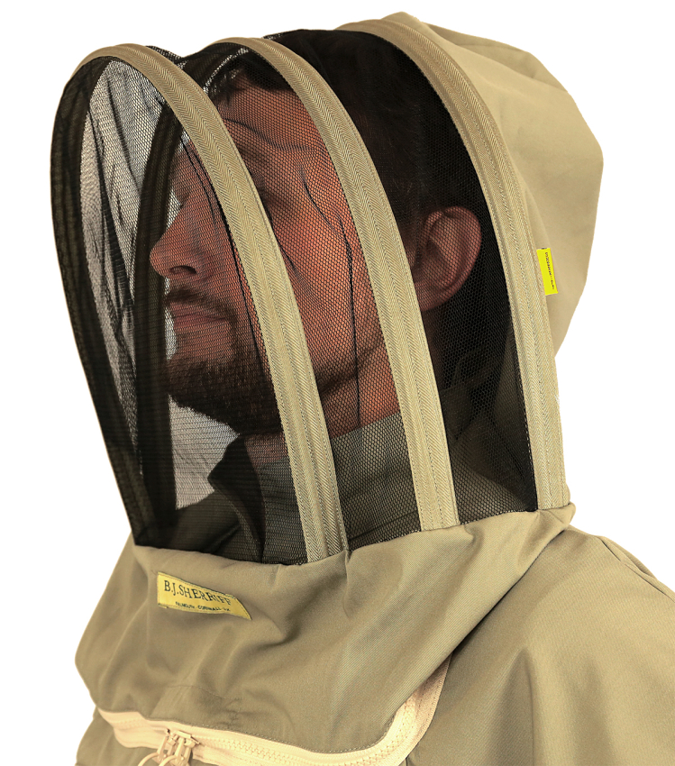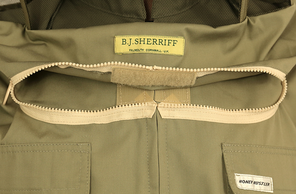 leichter und ergonomischer Imkeranzug, hergestellt in England aus 65% Polyester und 35% Baumwolle, khaki und voll waschbar. Ausgestattet mit vier großen Taschen, einstellbaren Gummibündchen an den Ärmeln, Bündchen und Reißverschluss an den Beinen. Die sich selbst aufstellende Imkerhaube mit schwarzem Visiergewebe lässt sich mittels Reißverschluss komplett abnehmen