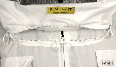 leichter und ergonomischer Imkeranzug, hergestellt in England aus 65% Polyester und 35% Baumwolle, weiß und voll waschbar. Ausgestattet mit vier großen Taschen, einstellbaren Gummibündchen an den Ärmeln, Bündchen und Reißverschluss an den Beinen. Die sich selbst aufstellende Imkerhaube mit schwarzem Visiergewebe lässt sich mittels Reißverschluss komplett abnehmen