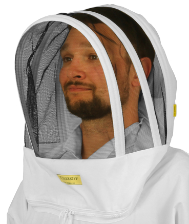 leichtes und ergonomisches Schutzhemd, hergestellt in England aus 65% Polyester und 35% Baumwolle, weiß und voll waschbar. Ausgestattet mit vier großen Taschen sowie einstellbaren Gummibündchen an den Ärmeln ist das Schutzhemd durch den Frontreißverschluss auch wie eine Jacke nutzbar. Die sich selbst aufstellende Imkerhaube mit schwarzem Visiergewebe lässt sich mittels Reißverschluss komplett abnehmen