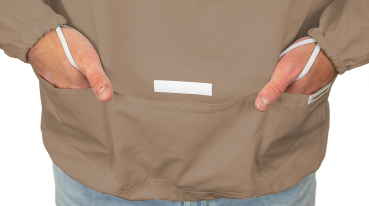 leichte und ergonomische Imkerbluse, hergestellt in England aus 65% Polyester und 35% Baumwolle. Mokka und voll waschbar, ausgestattet mit drei Bauchtaschen sowie Gummibündchen an den Ärmeln. Die sich selbst aufstellende Imkerhaube mit schwarzem Visiergewebe lässt sich mittels Reißverschluss komplett abnehmen
