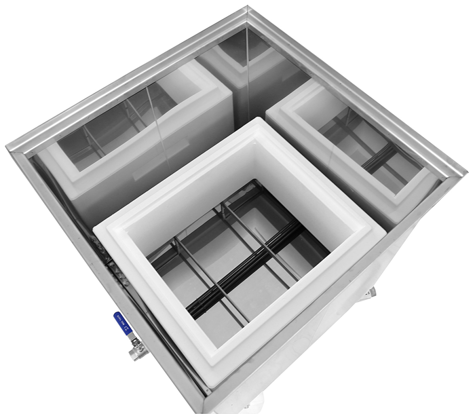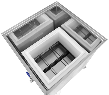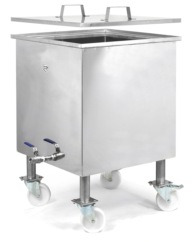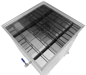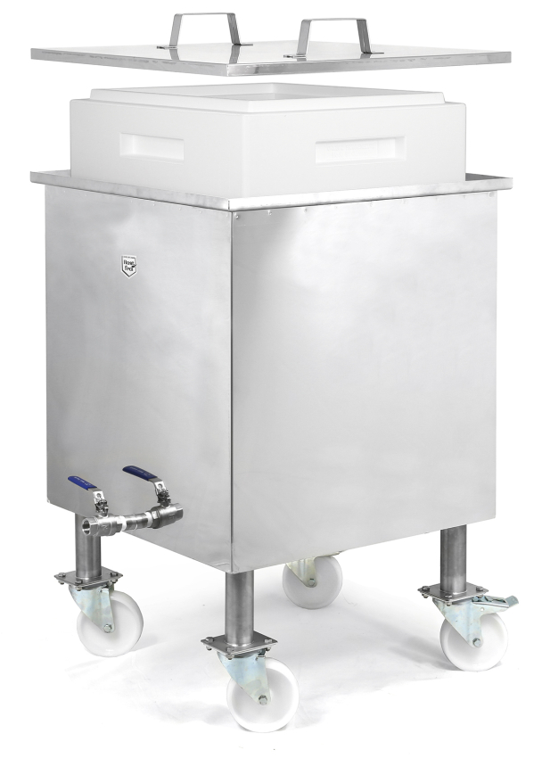 aus Edelstahl, zum Reinigen und Waschen von Rähmchen und Beutenteilen. Behälter mit zwei Einlegerosten, einem 3/4 Zoll Ablasshahn und vier Beinen mit Lenkrollen, zwei davon zum Feststellen. Innenmaß ca. 60 x 60 cm, Höhe ca. 61 cm, Außen ca. 64 x 64 cm, Höhe ca. 102 cm, Gewicht ca. 31 kg