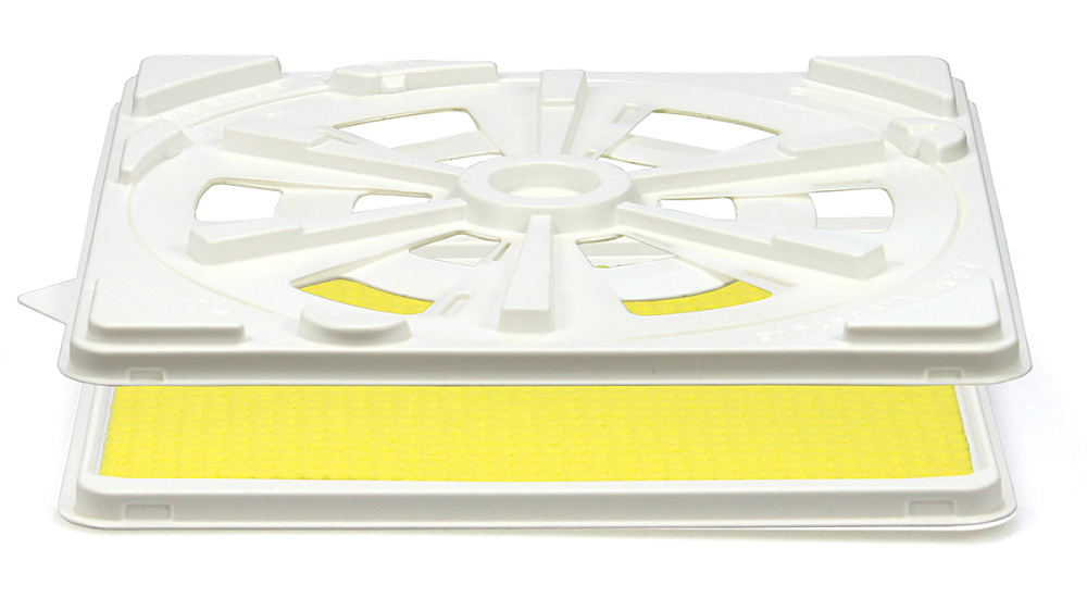 bestehend aus Bodenplatte, gelbem Mehrzwecktuch und Deckel mit drehbarer Scheibe zum Einstellen der Verdunstungsmenge. Größe ca. 25 x 25 cm