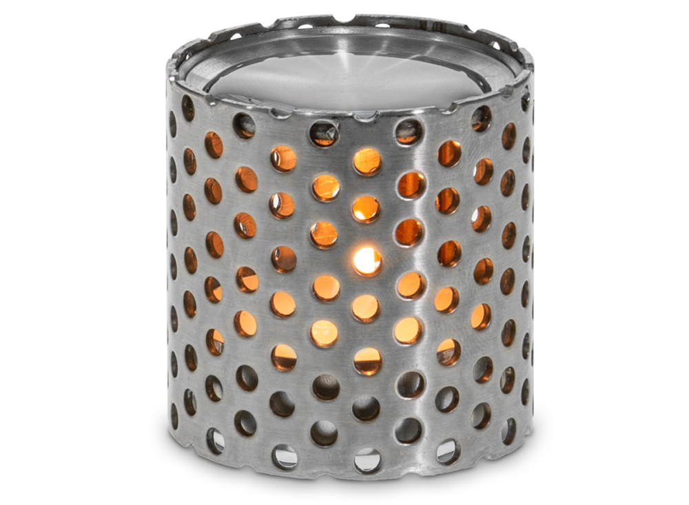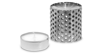bestehend aus einem Edelstahl-Stanzgitter-Stövchen mit gewölbtem Dach und einem fertigen Teelicht zum Verdampfen, getestet von Dr. Liebig