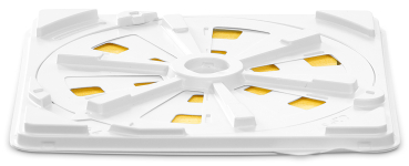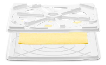 bestehend aus Bodenplatte, gelbem Mehrzwecktuch und Deckel mit drehbarer Scheibe zum Einstellen der Verdunstungsmenge. Größe ca. 25 x 25 cm