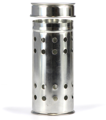 aus Edelstahl, mit Lochmantel und abnehmbarem Deckel mit Anhängehaken, zum Abbrennen der Schwefelschnitten. Ø 9 cm , Höhe 20,5 cm
