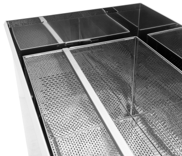 Mit variabler Rähmchen-Auflageschiene, passend zum Einhängen von bis zu 28 Waben in den gängigen Wabenmaßen von Normalmaß bis Dadant