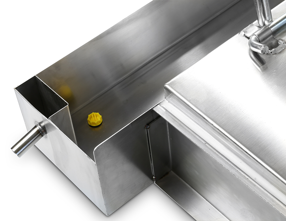 Wassergekühlte Mittelwand Gießanlage aus Edelstahl, ausgestattet mit zwei exakten Prägeflächen aus Silikonkautschuk in der Größe 395 x 260 mm , keine Lösmittel mehr erforderlich. Die Wasserkühlung erfolgt oben und unten durch Direktanschluss an eine Wasserleitung. Ein Deckelgriff erleichtert das Öffnen, das Restwachs wird vorne in einer Wanne aufgefangen. Lieferung mit Schöpfkelle, Reinigungspinsel und Anleitung, Gewicht ca. 10 kg