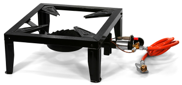 Hergestellt aus schwarzem, pulverbeschichteten Stahlblech, Brenner aus Gusseisen, inkl. 1,5 m langem Schlauch und Druckminderer