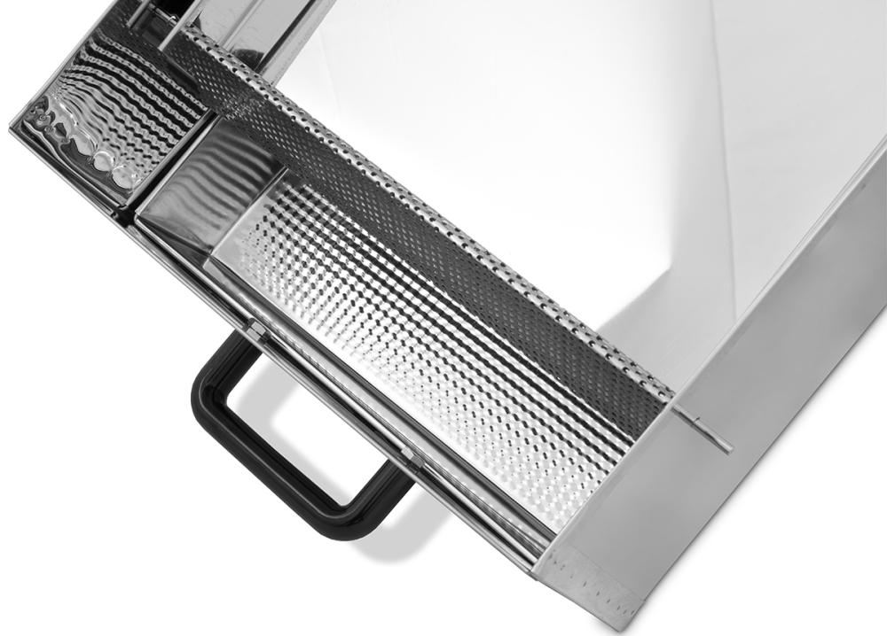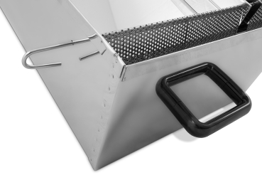 bestehend aus einem Edelstahl-Korpus mit Innenwanne und drehbarem Trester-Lochblech, Edelstahl-Rahmen mit Doppelstegplatte sowie zwei Tragegriffen