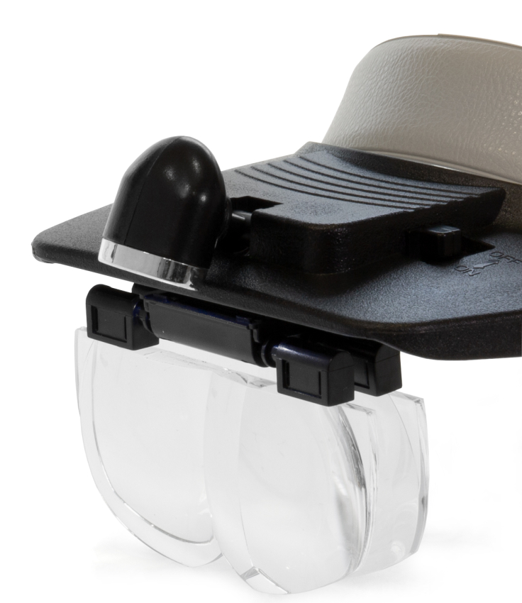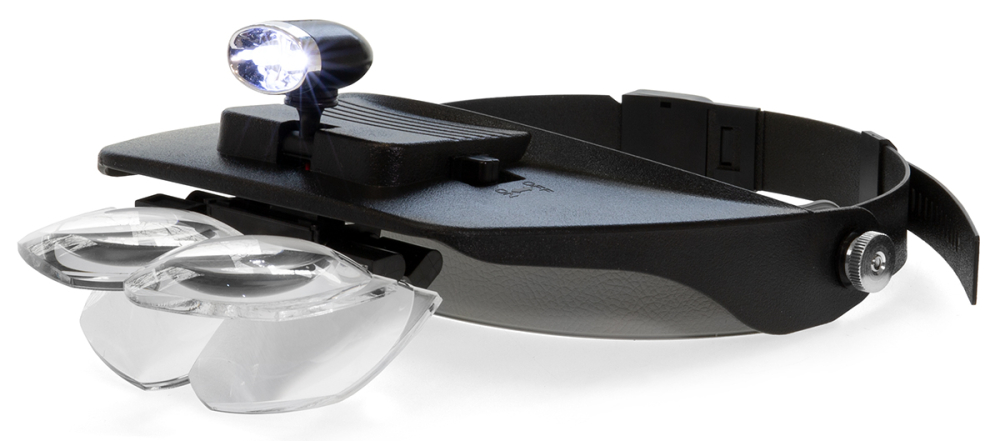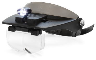 mit 1,2 bis 3,5-facher Vergrößerung. Durch Einschwenken der 2. Linse ist eine bis zu 6-fache Vergrößerung möglich. Front-Beleuchtung in 4 Richtungen einstellbar. Das gepolsterte Kopfband mit Clipverschluss lässt sich einstellen und mit Schrauben fixieren. Betrieb mit zwei Micro-Batterien Typ AAA 1,5 V, im Lieferumfang enthalten