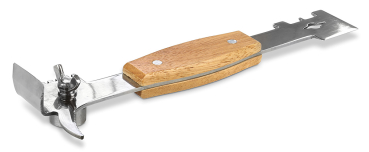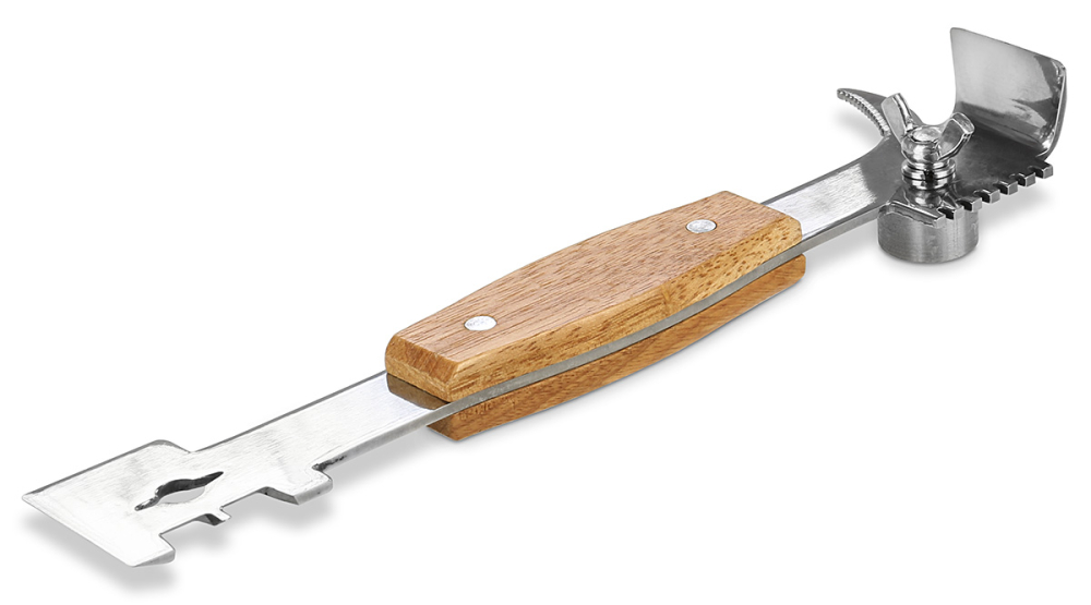 aus Edelstahl mit Wabenheber, Nagelzieher, Rillenkratzer, Draht-/Gitterreiniger, an-/abschraubbarem Einschlagblock und Holzgriff, beidseitig scharf geschliffen, 28 cm lang