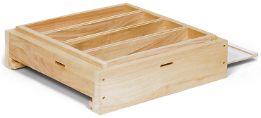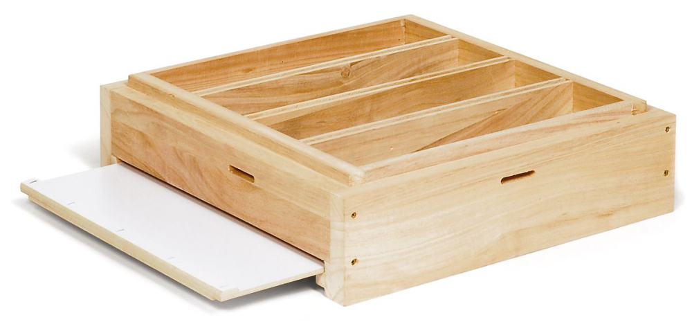 aus astfreiem Massivholz, mit Edelstahl Varroagitter, Bodenschieber und vier Fluglöchern. Durch Einsatz der Trennschiede können bis zu vier Ableger in einer Zarge gebildet werden Höhe 15 cm, Gewicht ca. 5 kg