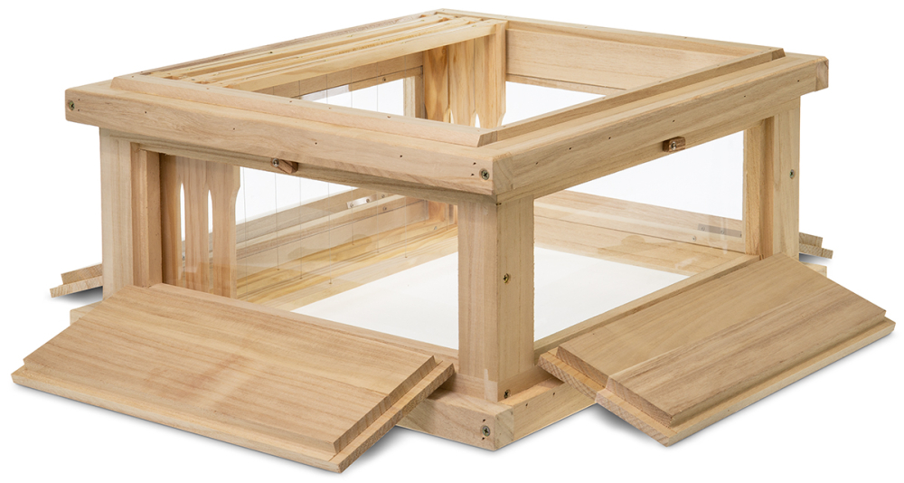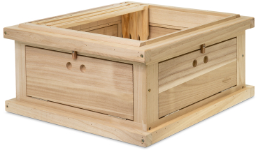 für 11 Rähmchen Normalmaß mit 223 mm Höhe. Der Clou sind die über Scharniere zu öffnenden vier Seitenwände hinter denen sich jeweils eine Plexi-Scheibe für den ungehinderten Blick in das Bienenvolk befindet. Die komplett umlaufende Griffleiste ermöglicht zusätzlich einen guten und sicheren Tragekomfort Design registriert beim DPMA und gesetzlich geschützt