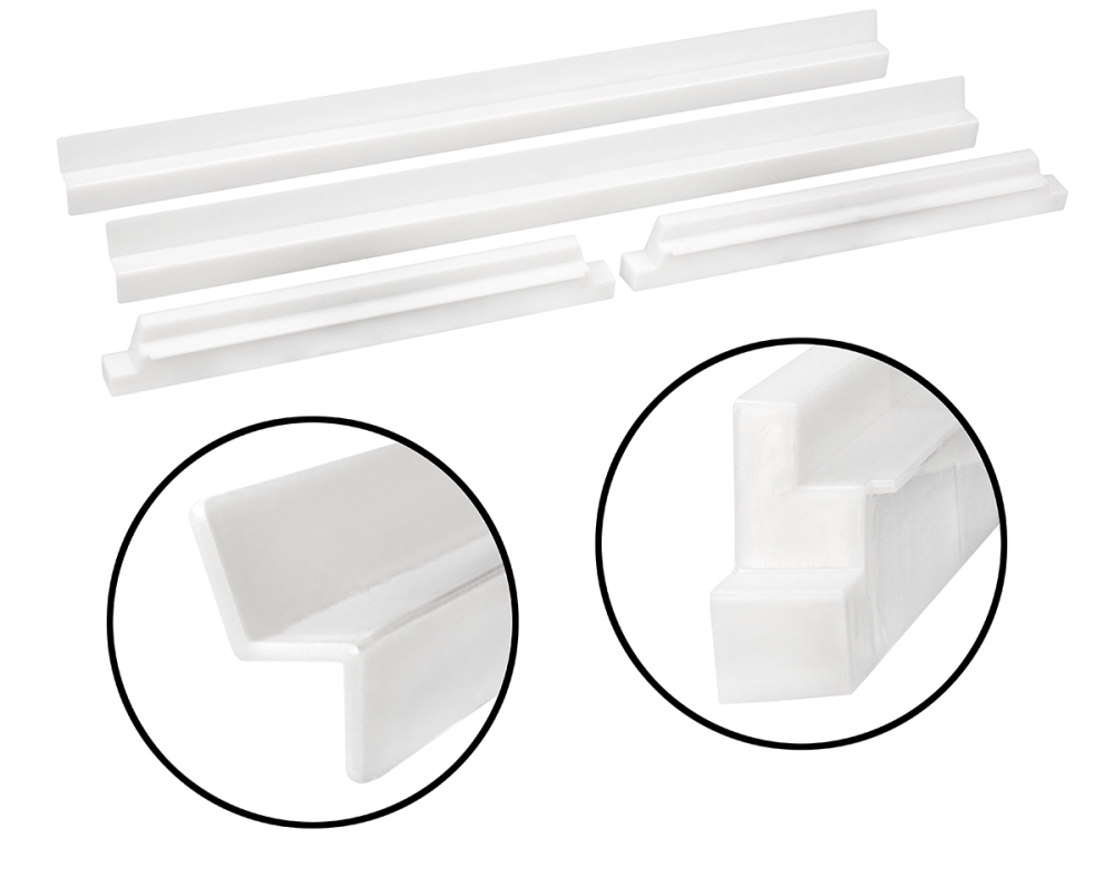 hergestellt aus lebensmittelechtem Kunststoff, passgenau für die neue Segeberger Vertikal Halbzarge. Der 4er Satz besteht aus zwei Winkel- und zwei Auflageschienen
