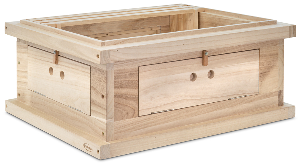für 9 Rähmchen Zander mit 220 mm Höhe. Der Clou sind die über Scharniere zu öffnenden vier Seitenwände hinter denen sich jeweils eine Plexi-Scheibe für den ungehinderten Blick in das Bienenvolk befindet. Die komplett umlaufende Griffleiste ermöglicht zusätzlich einen guten und sicheren Tragekomfort Auch passend für die Taunus Holzbeute